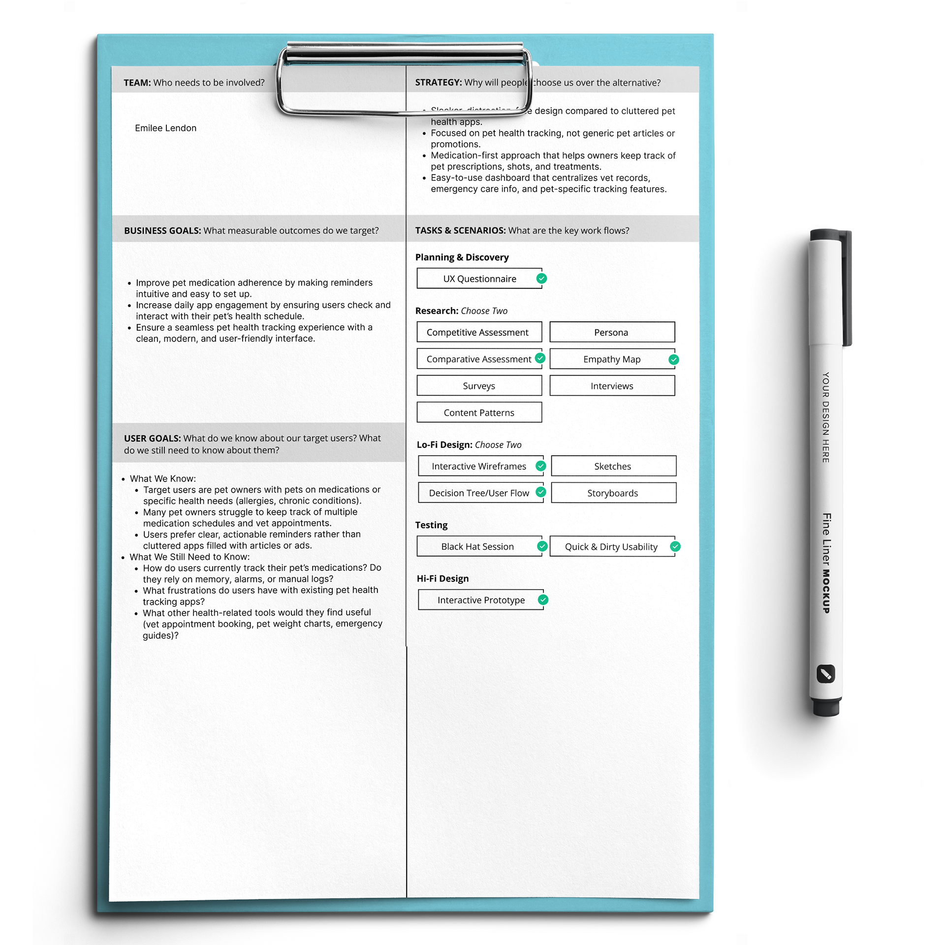 I started with a UX questionnaire provided for the project. It helped outline the key goals for the app and gave insight into who we were designing for. The questions focused on user needs, current frustrations, and what features would actually help with pet health management. It also guided early decisions about workflows, priorities, and what problems the app needed to solve first.