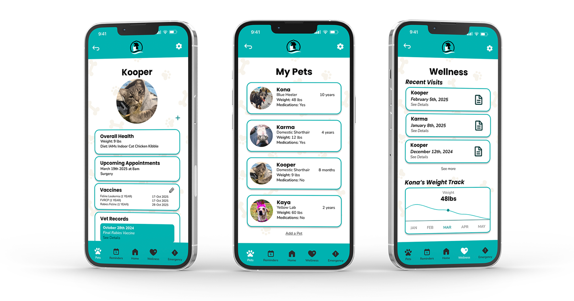 I also did a competitive assessment of existing pet health apps. Most were either too cluttered, lacked proper tracking features, or were geared more toward vet offices than everyday pet owners. That helped me focus this app on clean design, daily use, and making health info easy to access without digging through extra content.