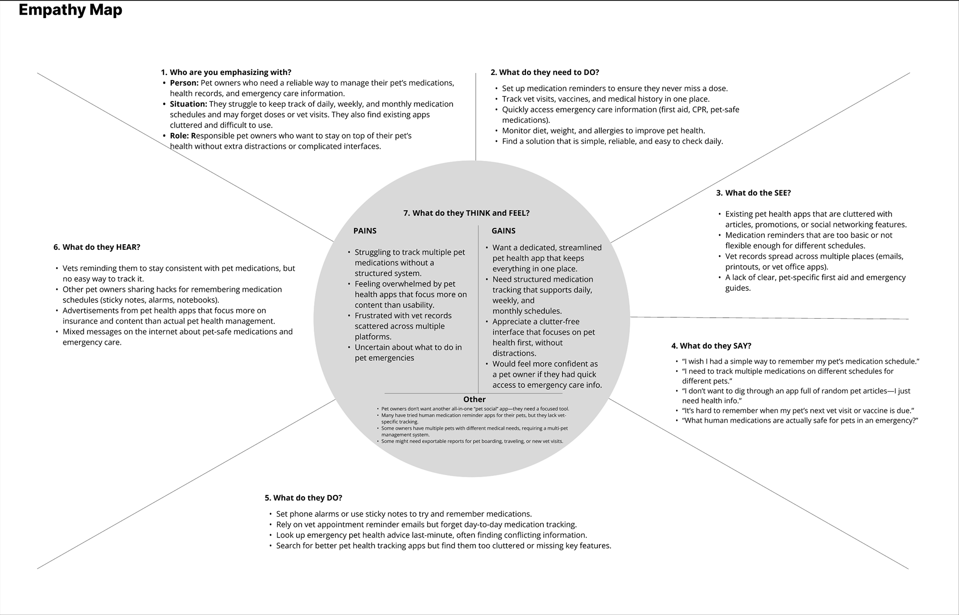 I created an empathy map to understand what pet owners actually need from a health tracking app. A lot of them are juggling multiple medications, vet visits, and emergency info across different platforms. The big takeaway was that users want something simple, reliable, and focused only on what matters.