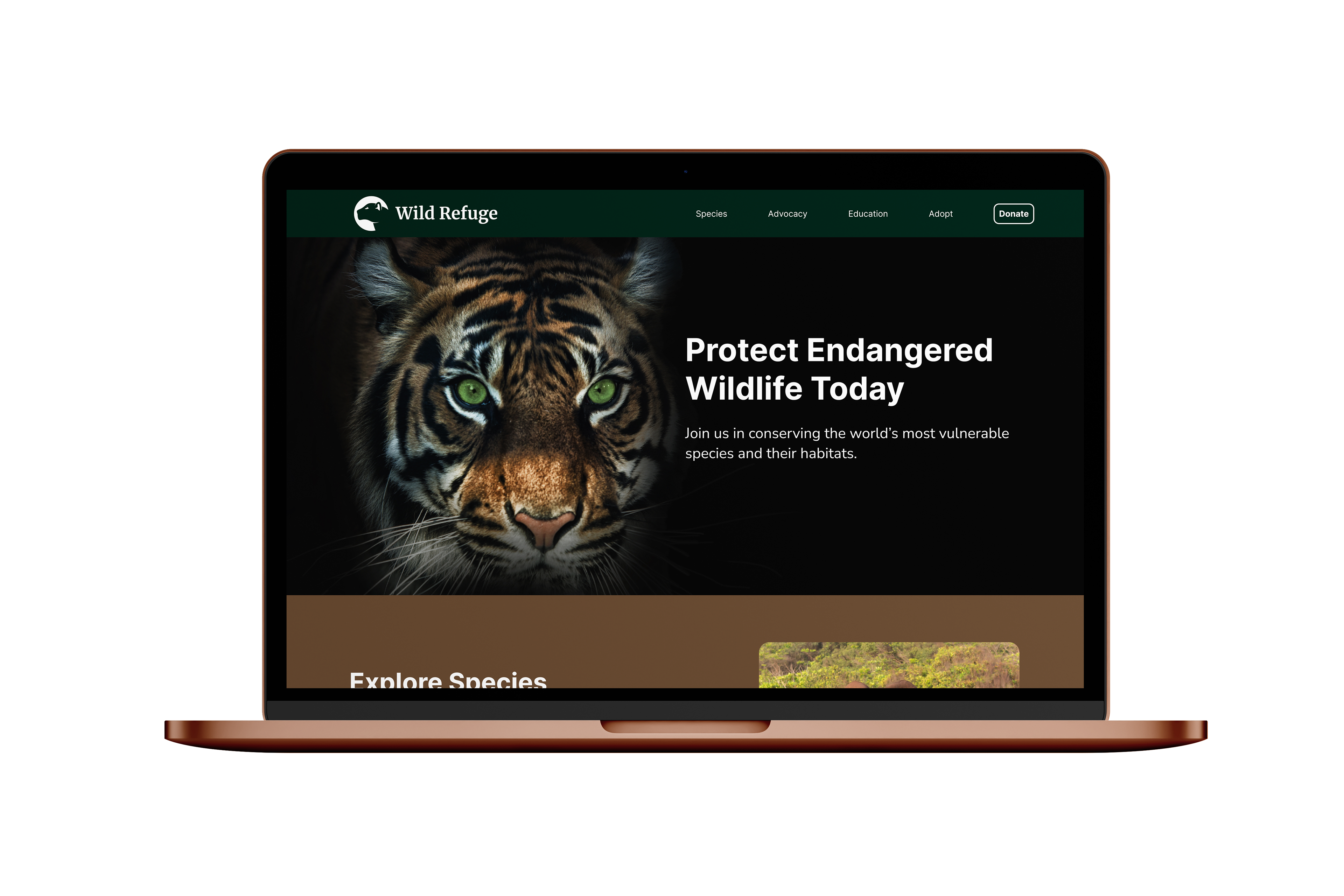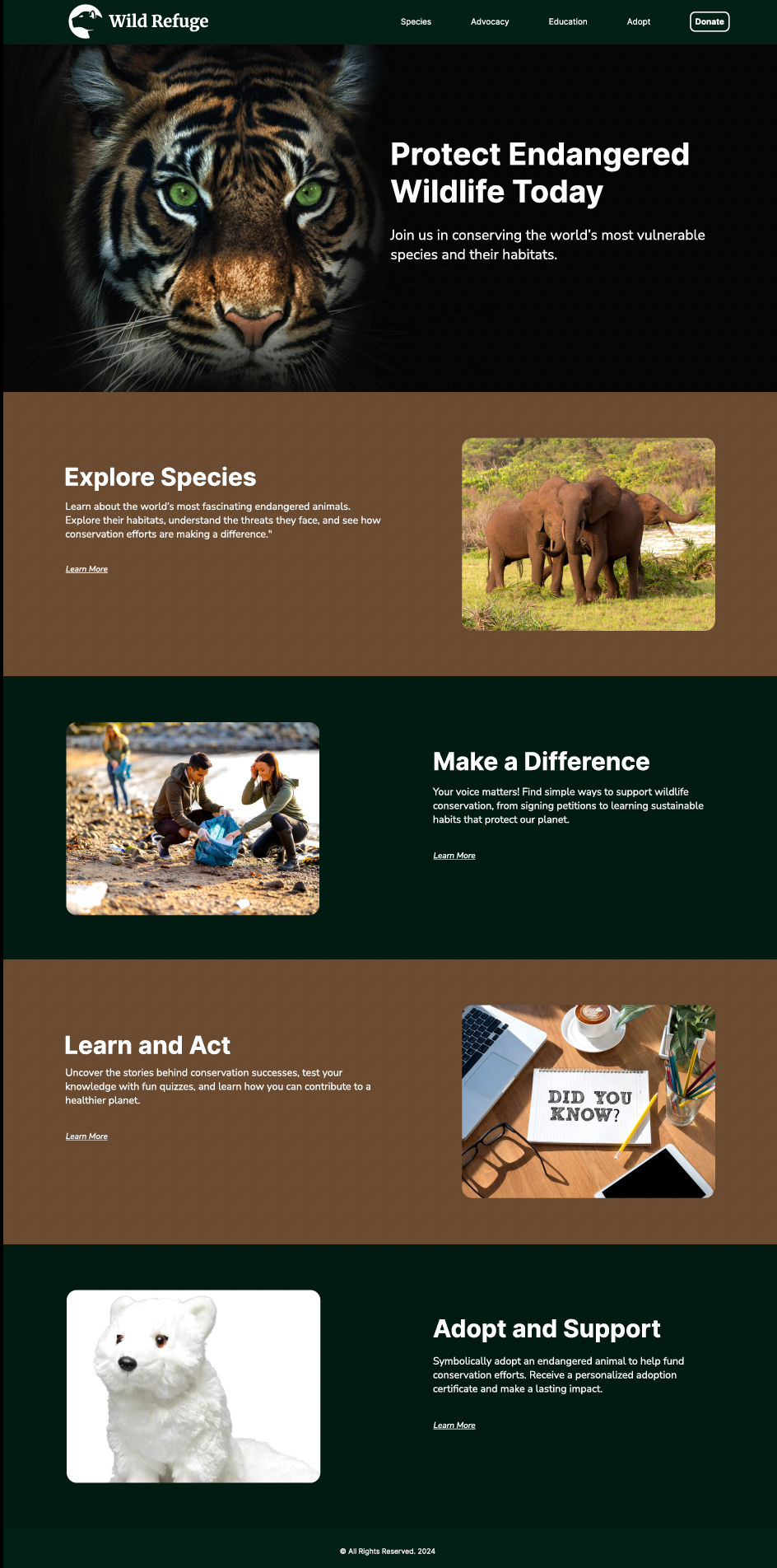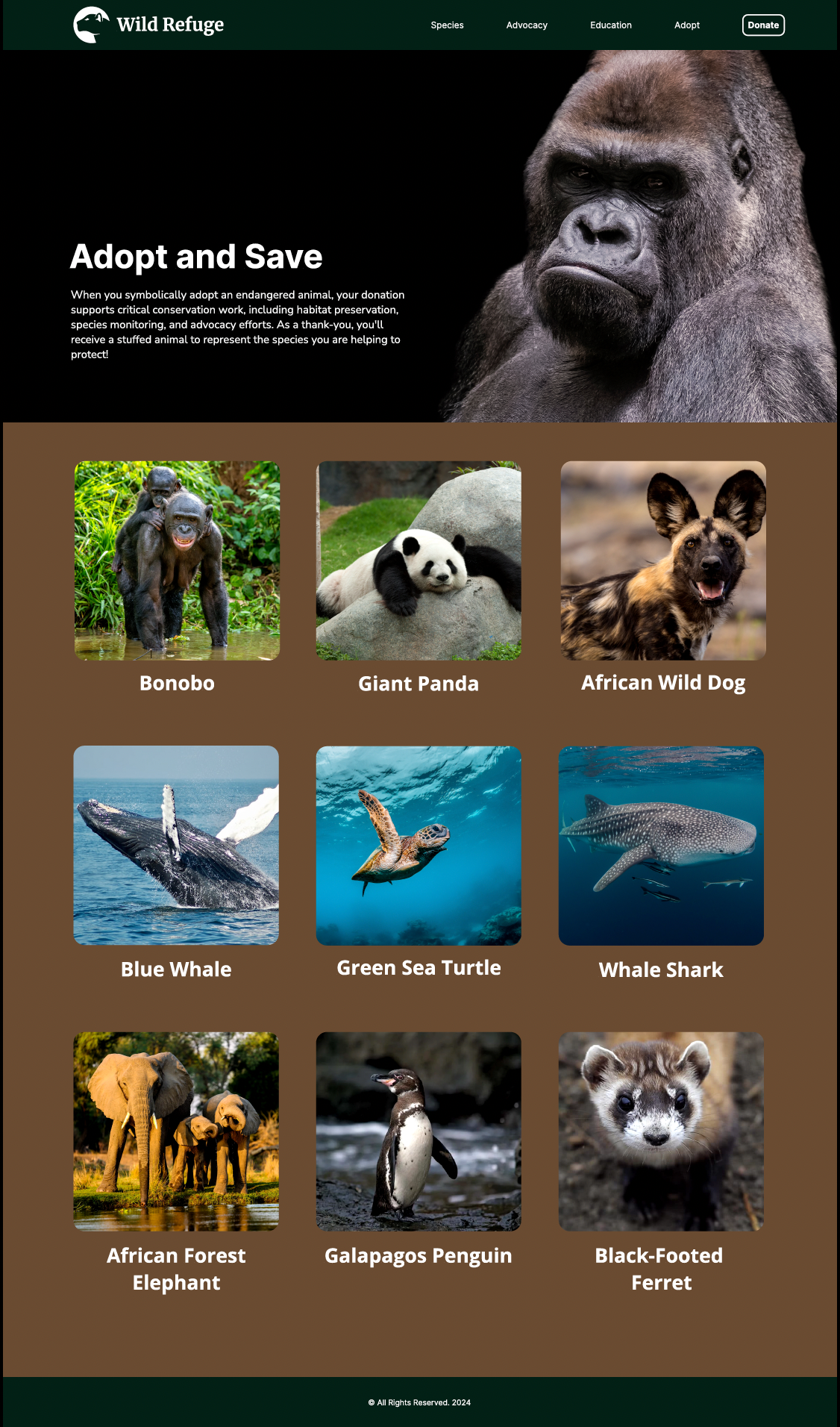 Using Figma to design a dynamic, interactive website dedicated to endangered species, this project aimed to raise awareness through an engaging educational experience. Rich visuals, intuitive navigation, and a vibrant, nature-inspired aesthetic bring the content to life. The site features species profiles, habitat details, and symbolic adoptions to encourage exploration and learning while reinforcing the importance of conservation.