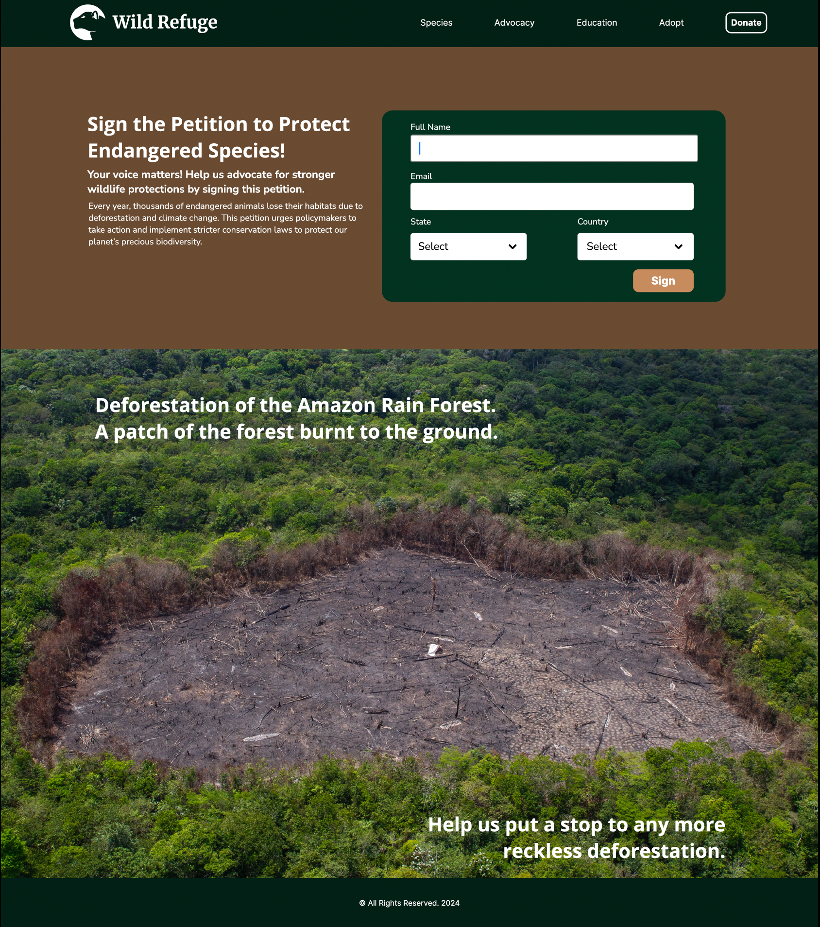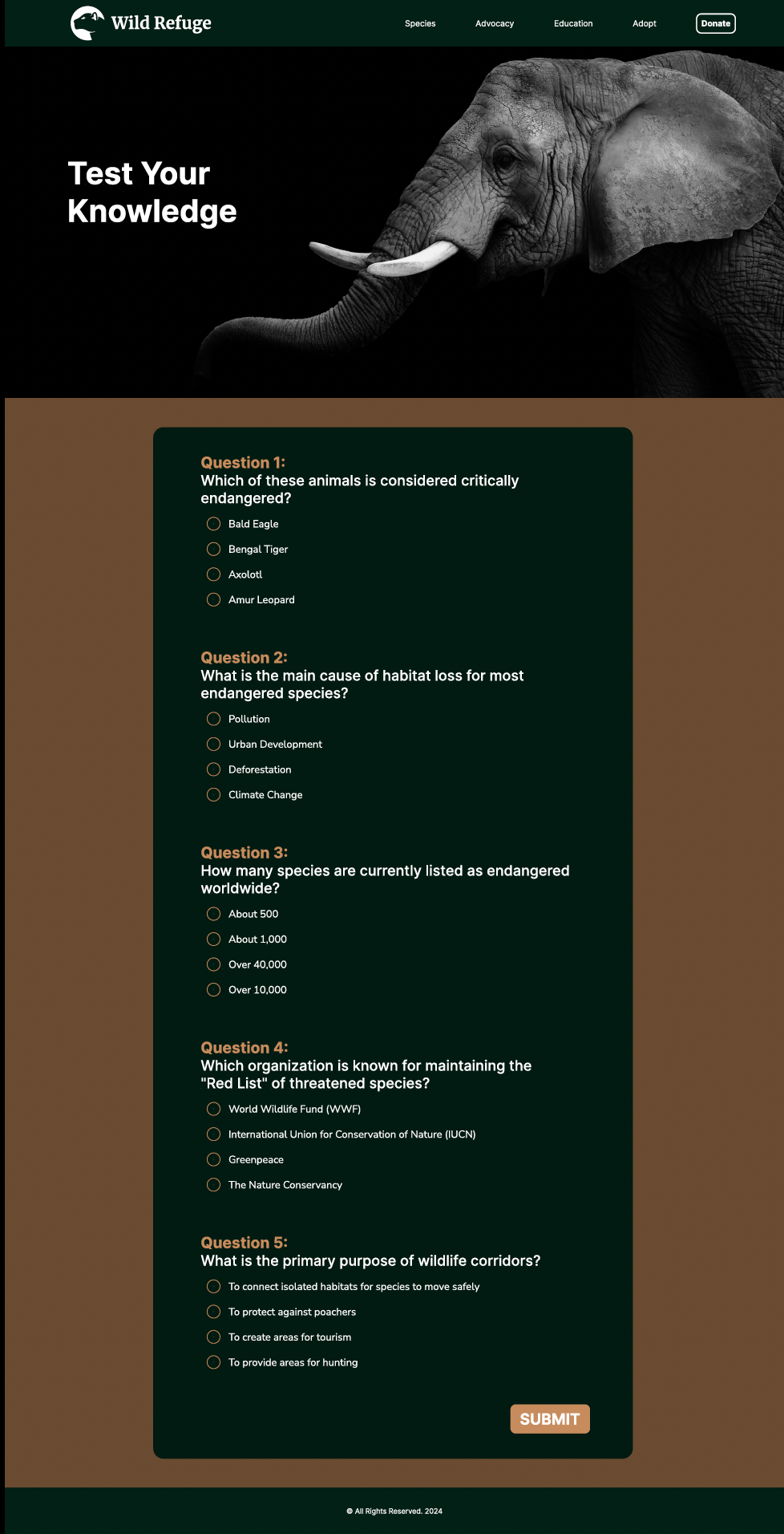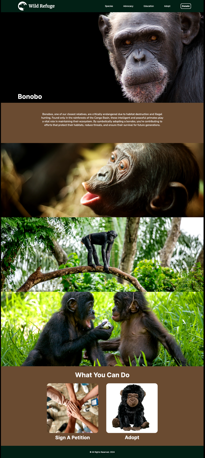 Using Figma to design a dynamic, interactive website dedicated to endangered species, this project aimed to raise awareness through an engaging educational experience. Rich visuals, intuitive navigation, and a vibrant, nature-inspired aesthetic bring the content to life. The site features species profiles, habitat details, and symbolic adoptions to encourage exploration and learning while reinforcing the importance of conservation.